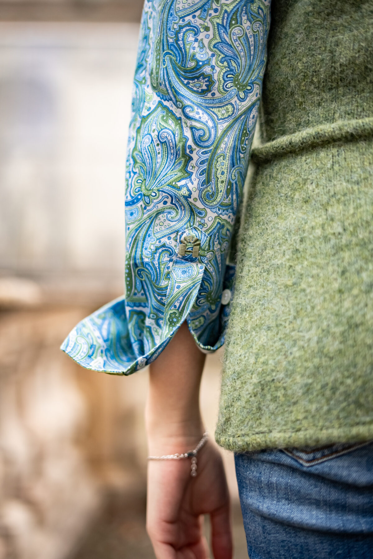 Bluse aus blau-grünem BW-Satin aus unserer “Heimatwerk Kollektion”, durch die verschiedenen Blau- und Grüntöne ist sie perfekt kombinierbar. Die hochwertige Bluse wurde mit viel Liebe zum Detail in Oberösterreich gefertigt, der Stoff stammt ebenfalls aus Österreich. Der hellgraue Fond ergänzt diese Farbkombination. Ein treuer Begleiter zu Jeans, Lederhose aber auch zu eleganten Röcken!