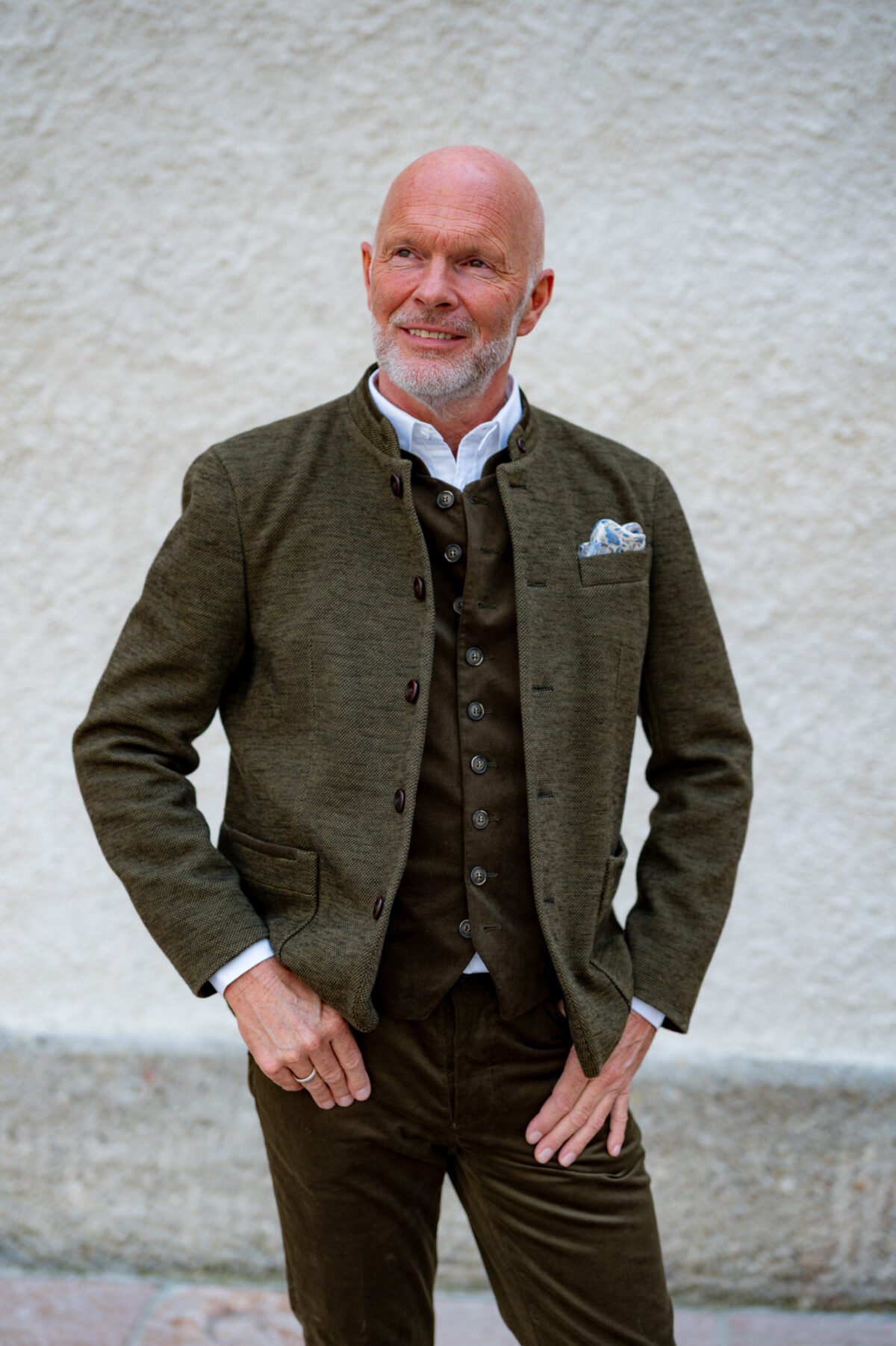 Sportlich geschnittenes Herrensakko in Oliv. Durch den Jersey Anteil ist ein hoher Tragekomfort gegeben. Stehkragen mit Kordapplikation. Komplett gefüttert.