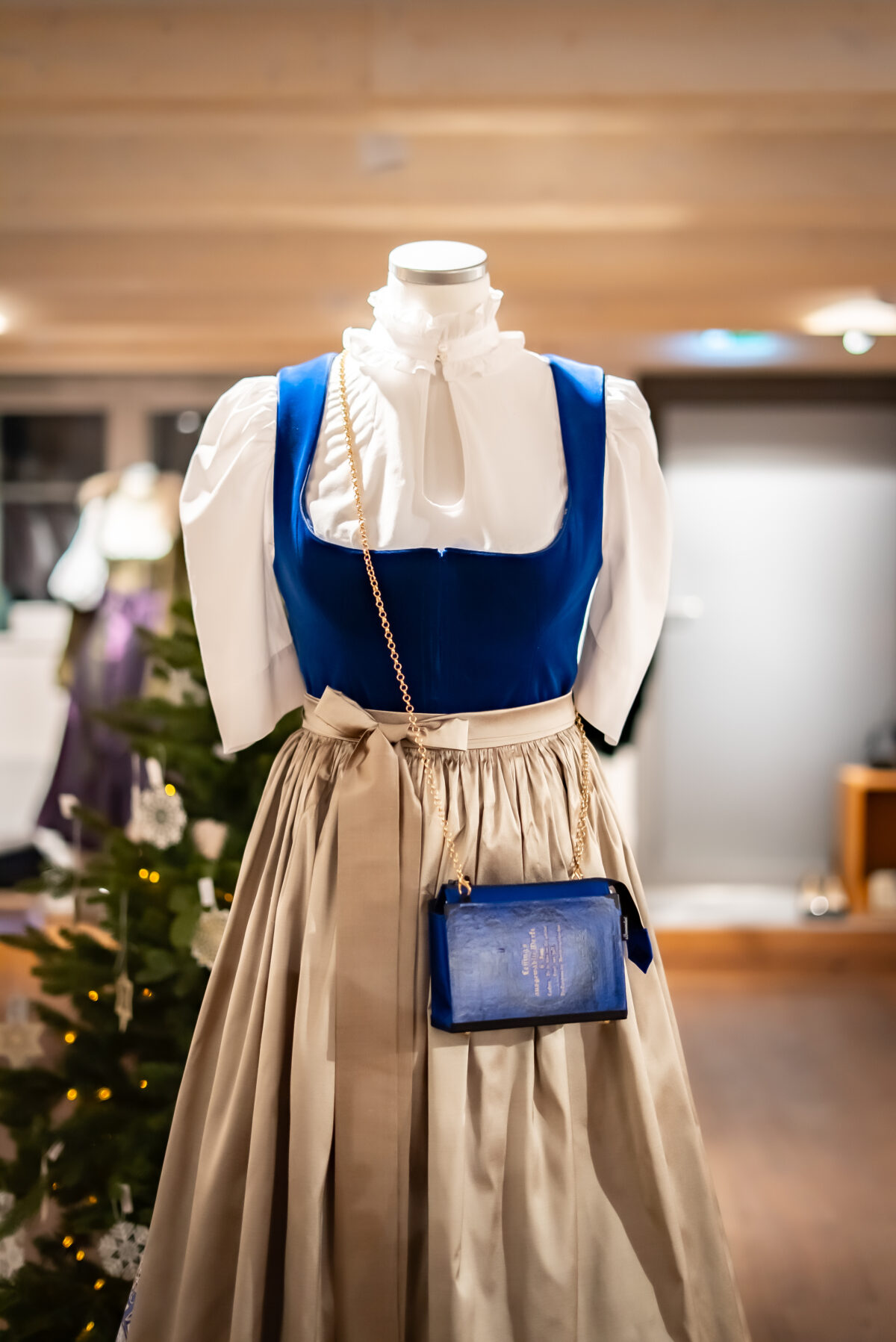 Elegantes Dirndl mit einem edlen Samtoberteil in mittelblau im Miederschnitt mit Hackenverschluß. Der herrlich gemusterte Baumwoll-Rock mit einem Vorstoss aus blauem Seidentaft ist genau so ein festliches Detal, wie die Seiden Passepoile. Die farblich abgestimmte Seiden-Taftschürze ergänzt das festliche Erscheinungsbild. Qualität aus Österreich die man sieht und spürt. Durch die 80er Rocklänge ist dieses Dirndl aus der Werkstatt des Salzburger Heimatwerks ein perfekter Begleiter für festliche Anlässe.