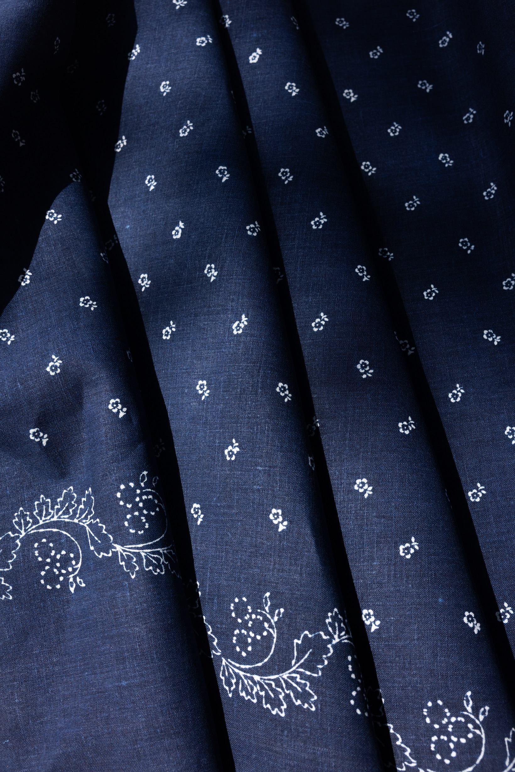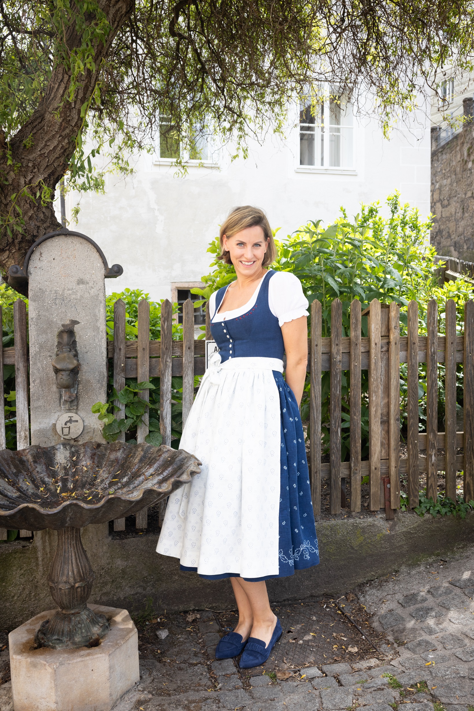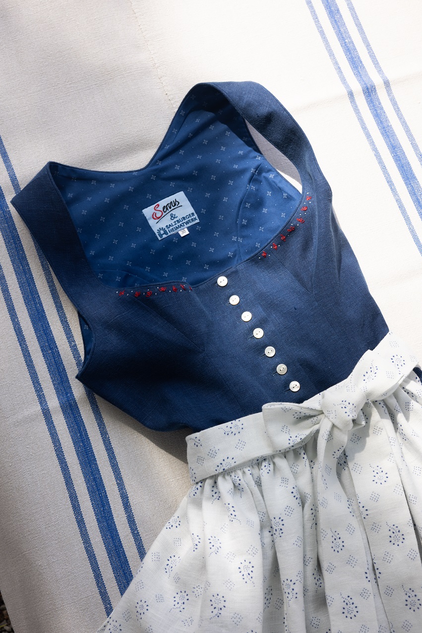 Handgenähtes Blaudruck-Dirndl aus dem Salzburger Heimatwerk, aus blaugefärbtem Leinen mit Blaudruck und weißer Leinenschürze mit Direktdruck in Blau, roter Zierstickerei und Perlmuttknöpfen aus dem Waldviertel.