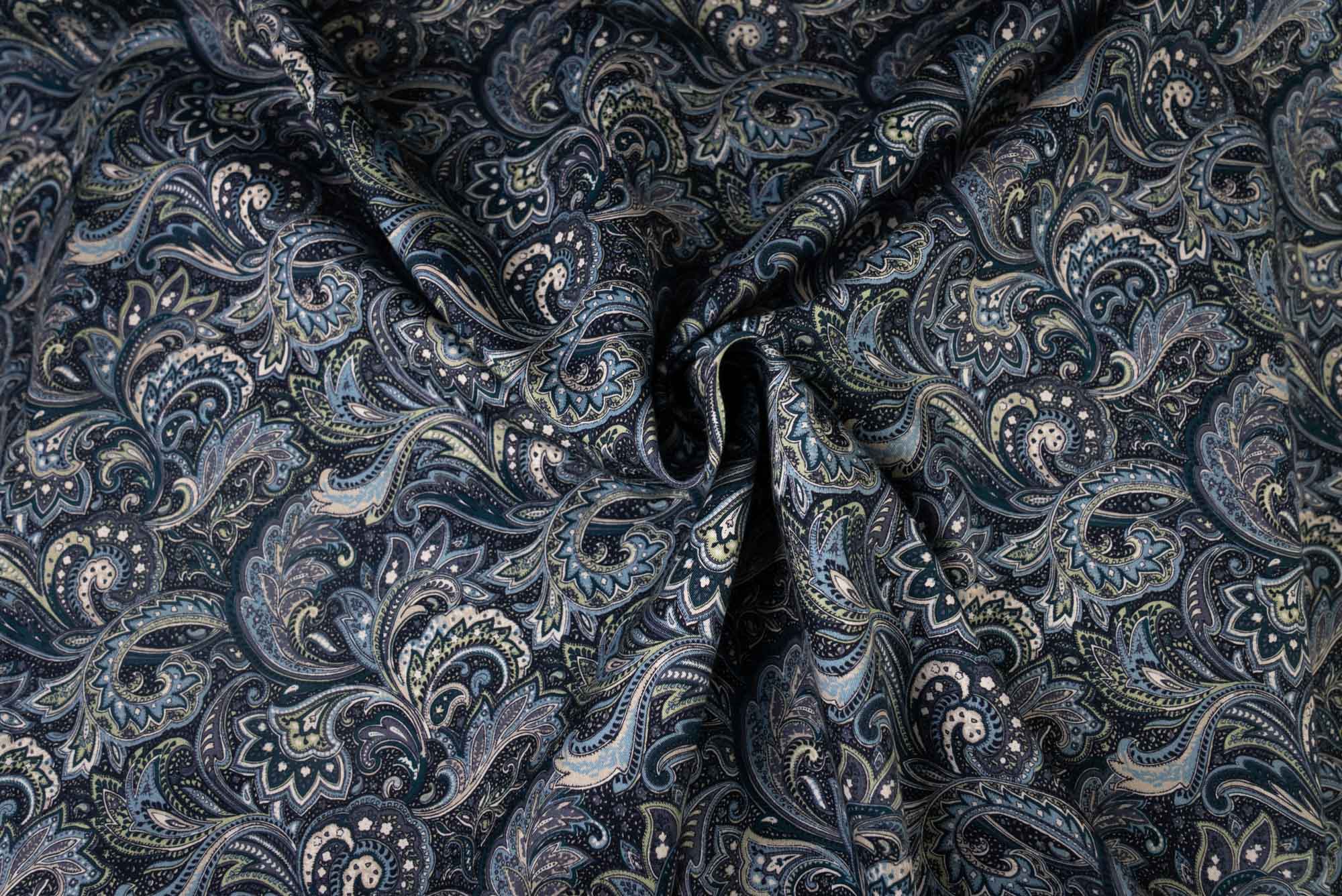 Der Stoff wird aus den Fasern der Baumwollpflanze gewonnen, hat einen kühlen, „wolligen“ Griff und fällt angenehm weich. Er wird in Österreich eingefärbt und mit traditionellen Mustern bedruckt.