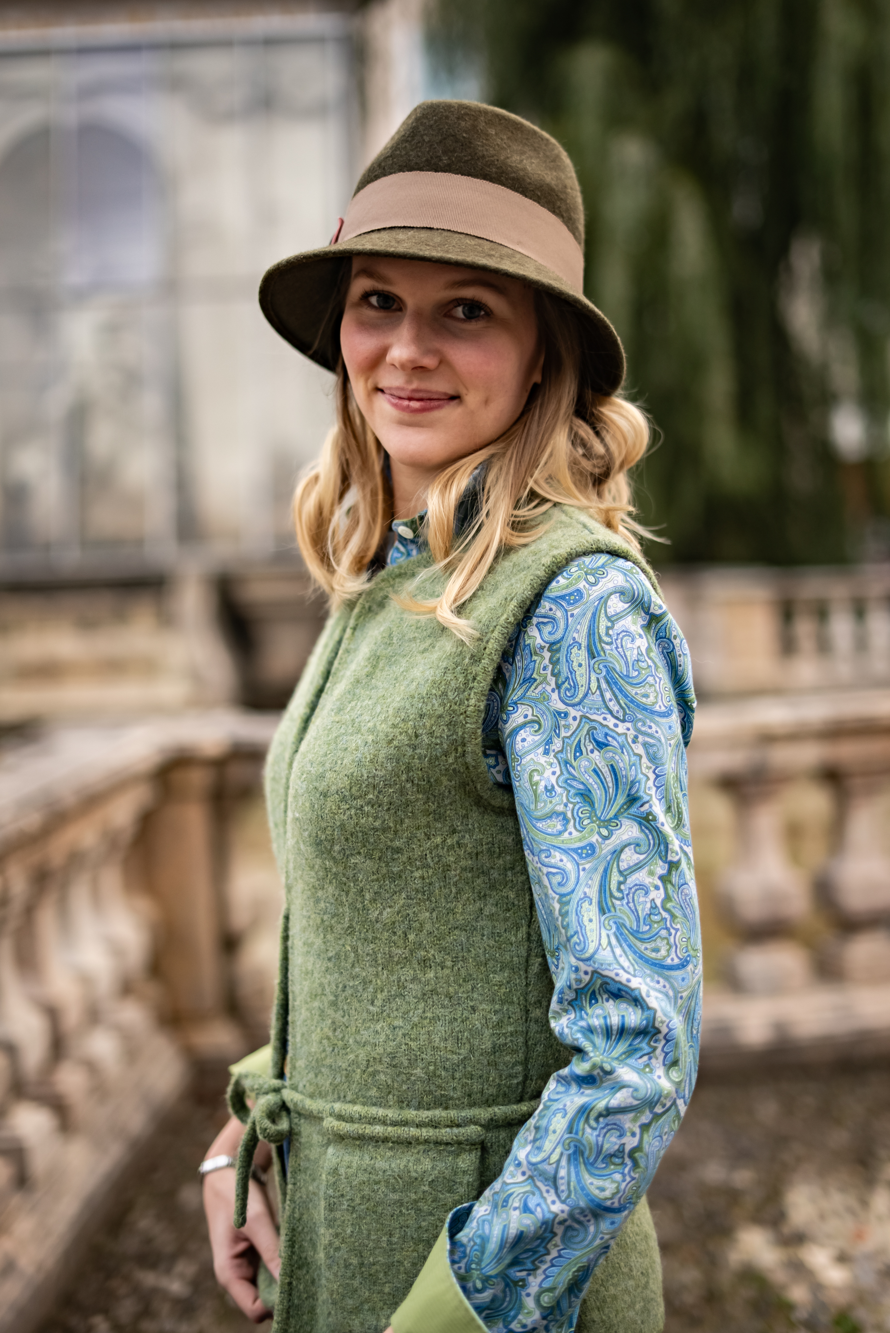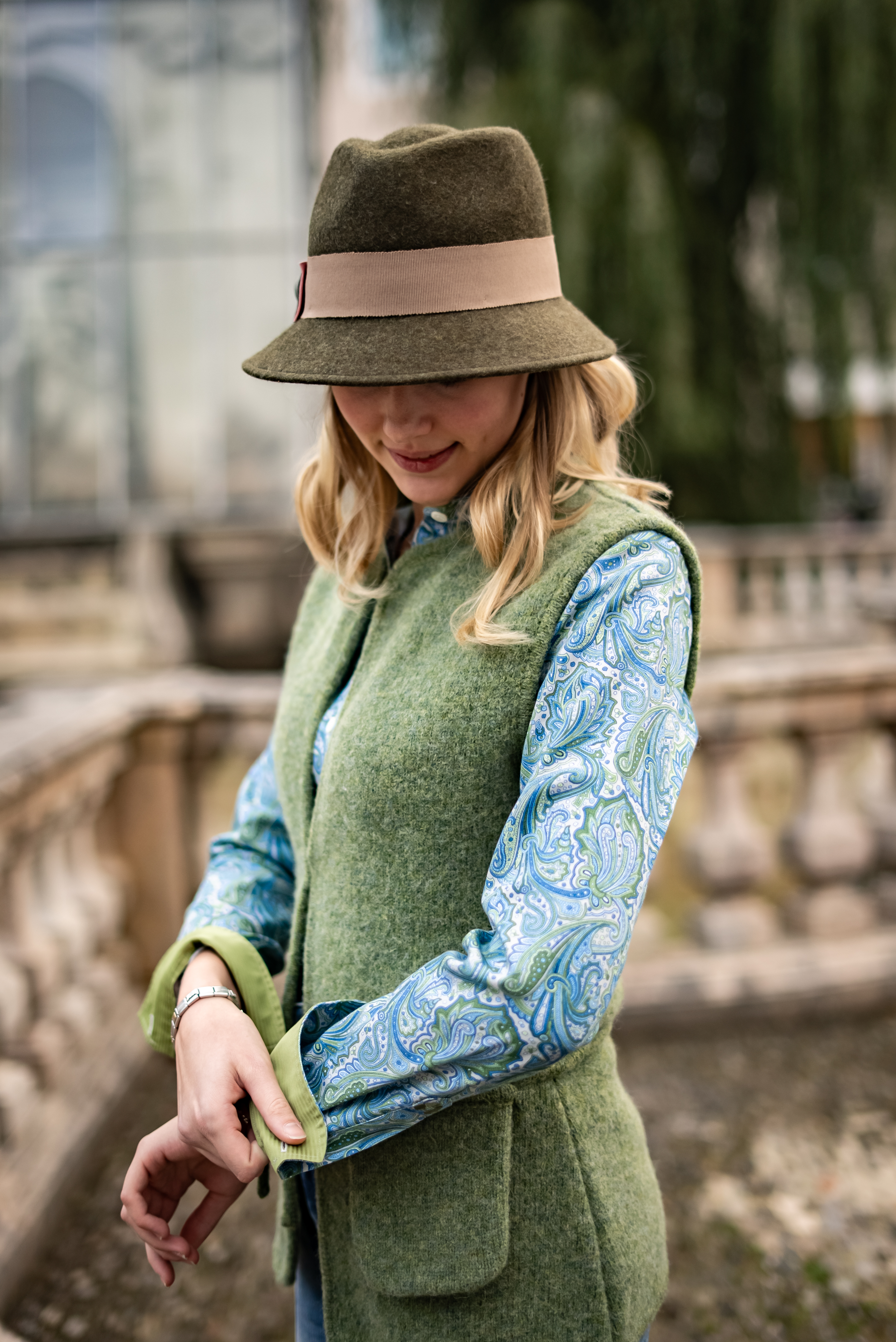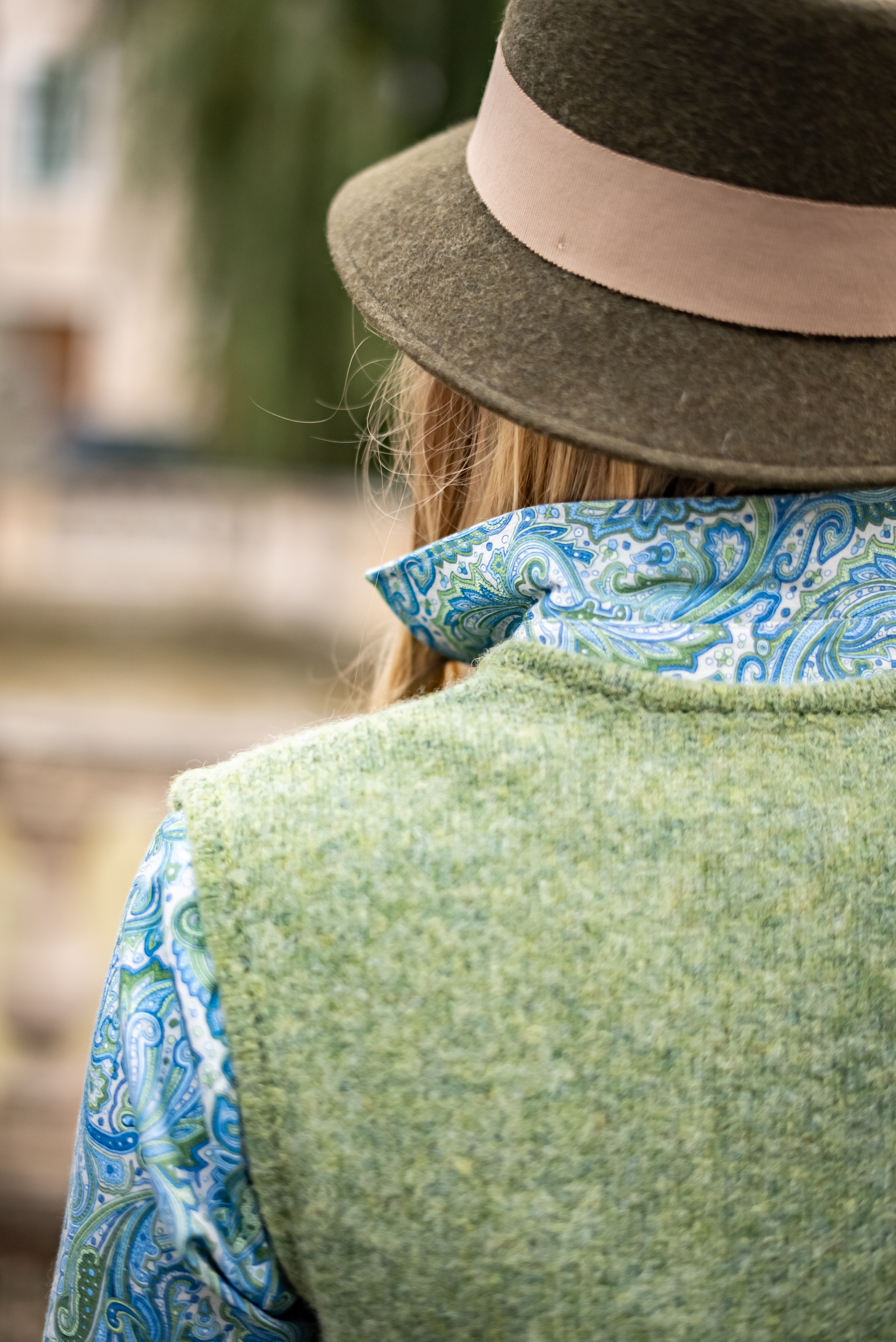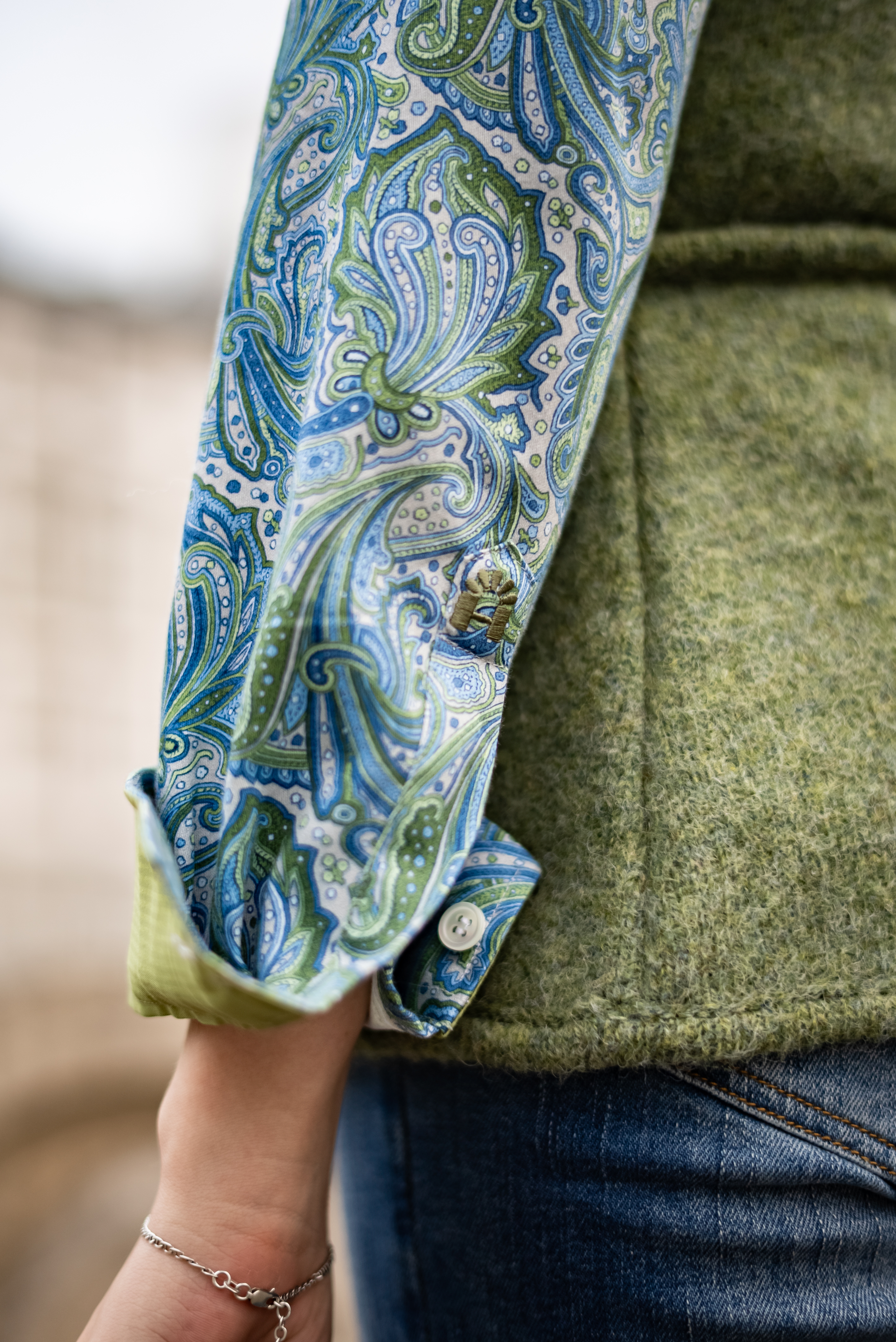 Bluse aus blau-grünem BW-Satin, durch die verschiedenen Blau- und Grüntöne ist sie perfekt kombinierbar. Der hellgraue Fond ergänzt diese Farbkombination. Ein treuer Begleiter zu Jeans, Lederhose aber auch zu eleganten Röcken!