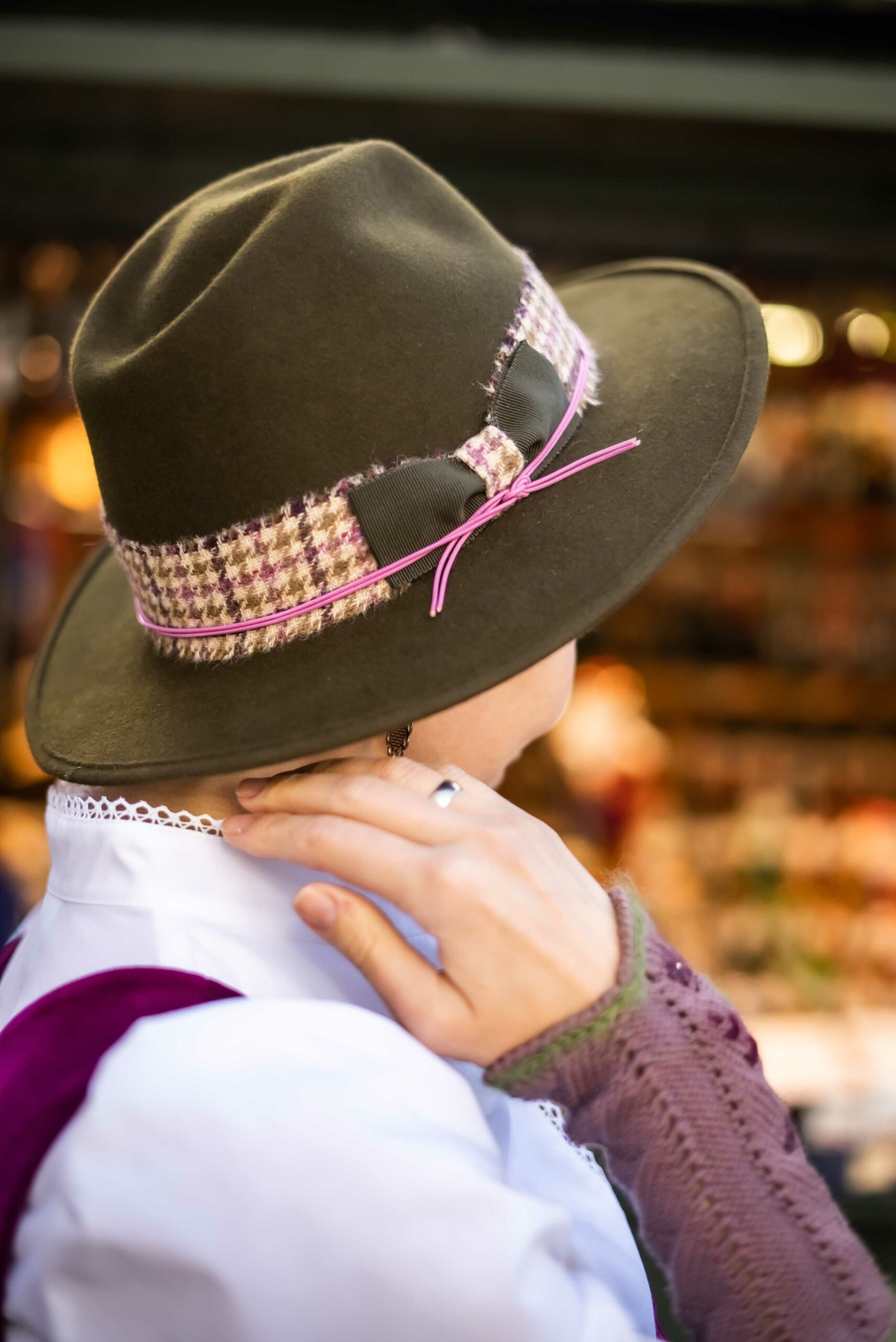 Original Ischler Bittner-Damen Haarhut mit mit trendigem Ripsband und einem feinen Lederband in Kontrastfarbe. Masche als Hingucker – handgefertigt mit Liebe zum Detail.