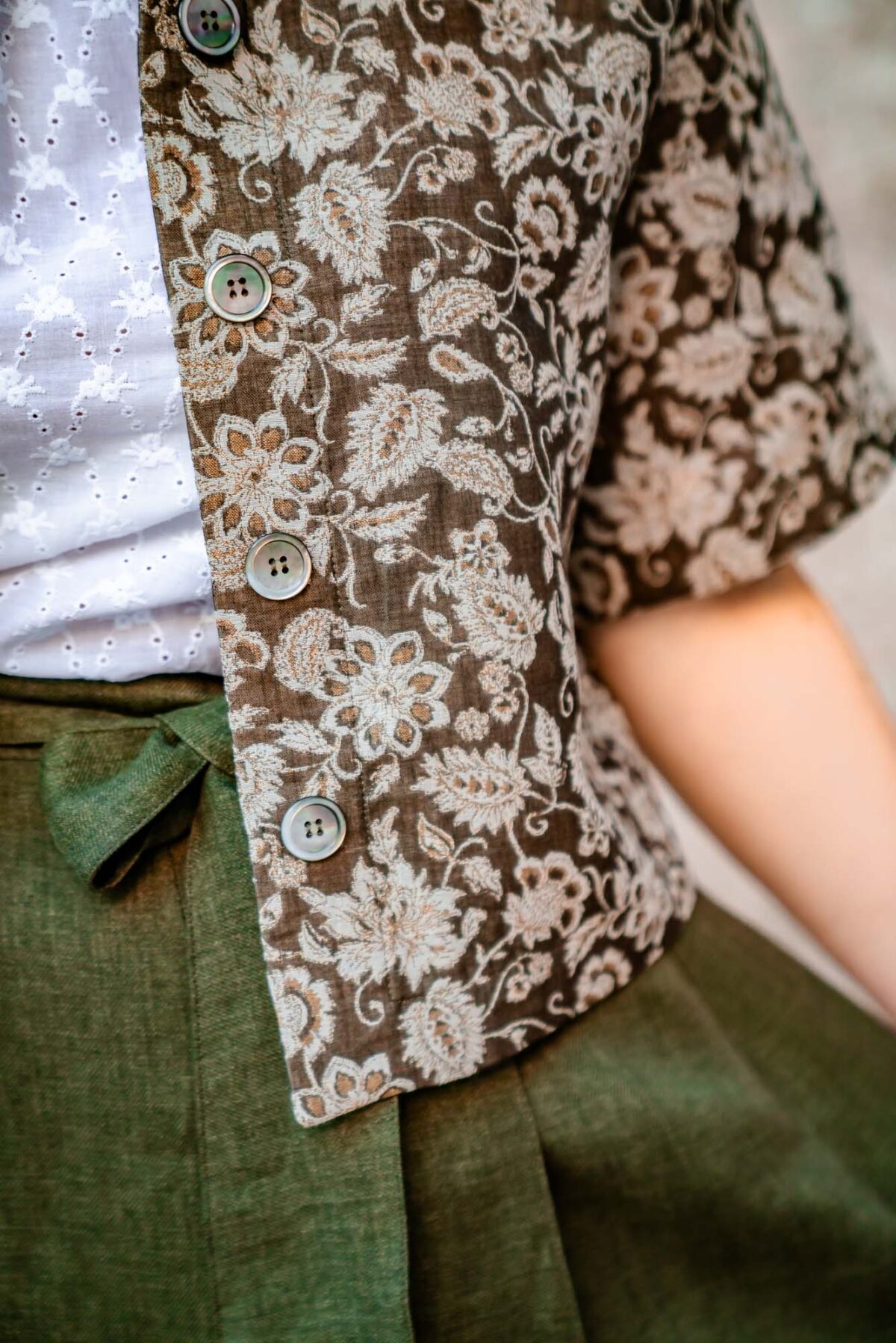 Sommerliche Kurzjacke aus reiner Baumwolle. Durch den gewebten Stoff und die unterschiedlichen Grüntöne ist sie perfekt zu Röcken, Kleidern und Hosen kombinierbar. Kurze Ärmel und praktische Eingrifftaschen machen diese Jacke zum Sommerlichen „must have“ – Rückenlänge ca. 49cm