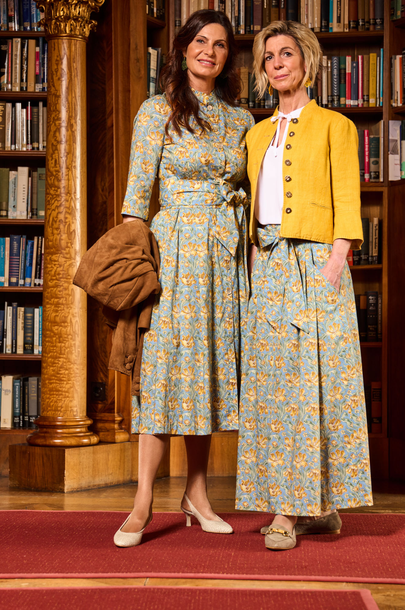 Der gezeigte Baumwollrock ist klassisch-trachtig interpretiert und wirkt zugleich leicht, sommerlich und elegant. Der Stoff besteht aus Baumwolle mit einem feinen, allover floralen Druck in Hellblau, Ocker und dezenten Naturtönen. Dieses Muster verleiht dem Rock eine lebendige, aber dennoch harmonische Ausstrahlung, die typisch für hochwertige Trachtenstoffe ist. Der Schnitt ist weit schwingend und in einer etwas längeren Form gehalten. Durch die eingelegten Falten entsteht ein schönes Volumen, das beim Gehen weich fällt und für eine feminine Silhouette sorgt. Zwei Eingrifftaschen.