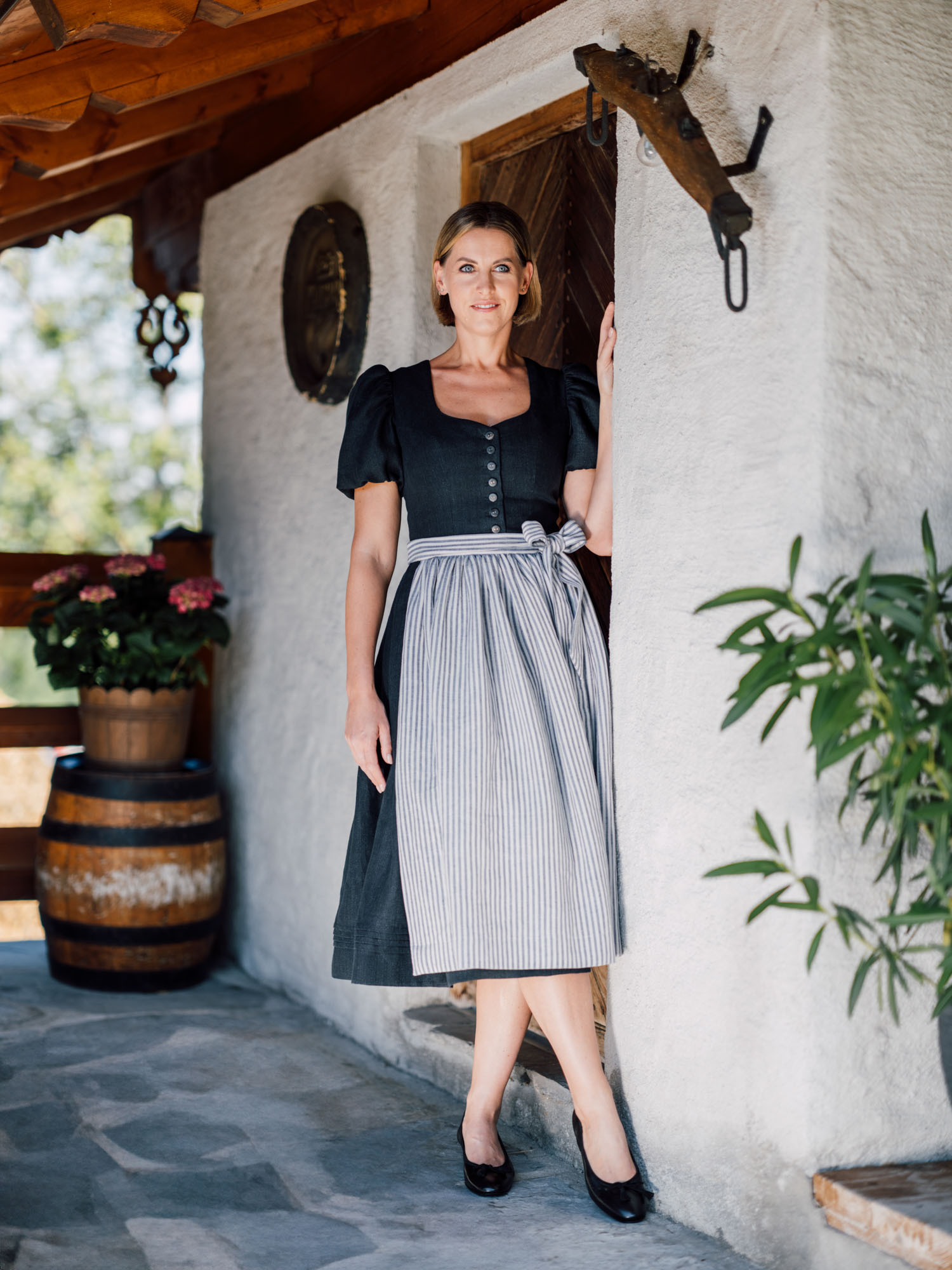 Wunderschönes Leinendirndl in schwarz mit Streifschürze aus Halbleinen. Dank hochwertiger Leinen-Qualität begeistert das Modell mit traditioneller Aufmachung sowie romantischer Note durch die femininen Puffärmel. Der in Falten gelegte Rock mit den Biesen vollendet dieses einzigartige Dirndl und macht es zu einem zeitlosen Begleiter! Das Kleid kann auch ohne Schürze mit Gürtel getragen werden und ist auch an heißen Sommertagen ein traumhaftes Outfit. Qualität die man sieht und spürt – Qualität aus dem Salzburger Heimatwerk. Designt und verarbeitet im Herzen der Salzburger Altstadt in unserer Maßwerkstatt.