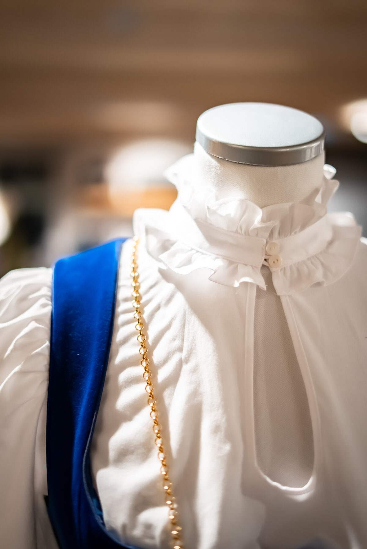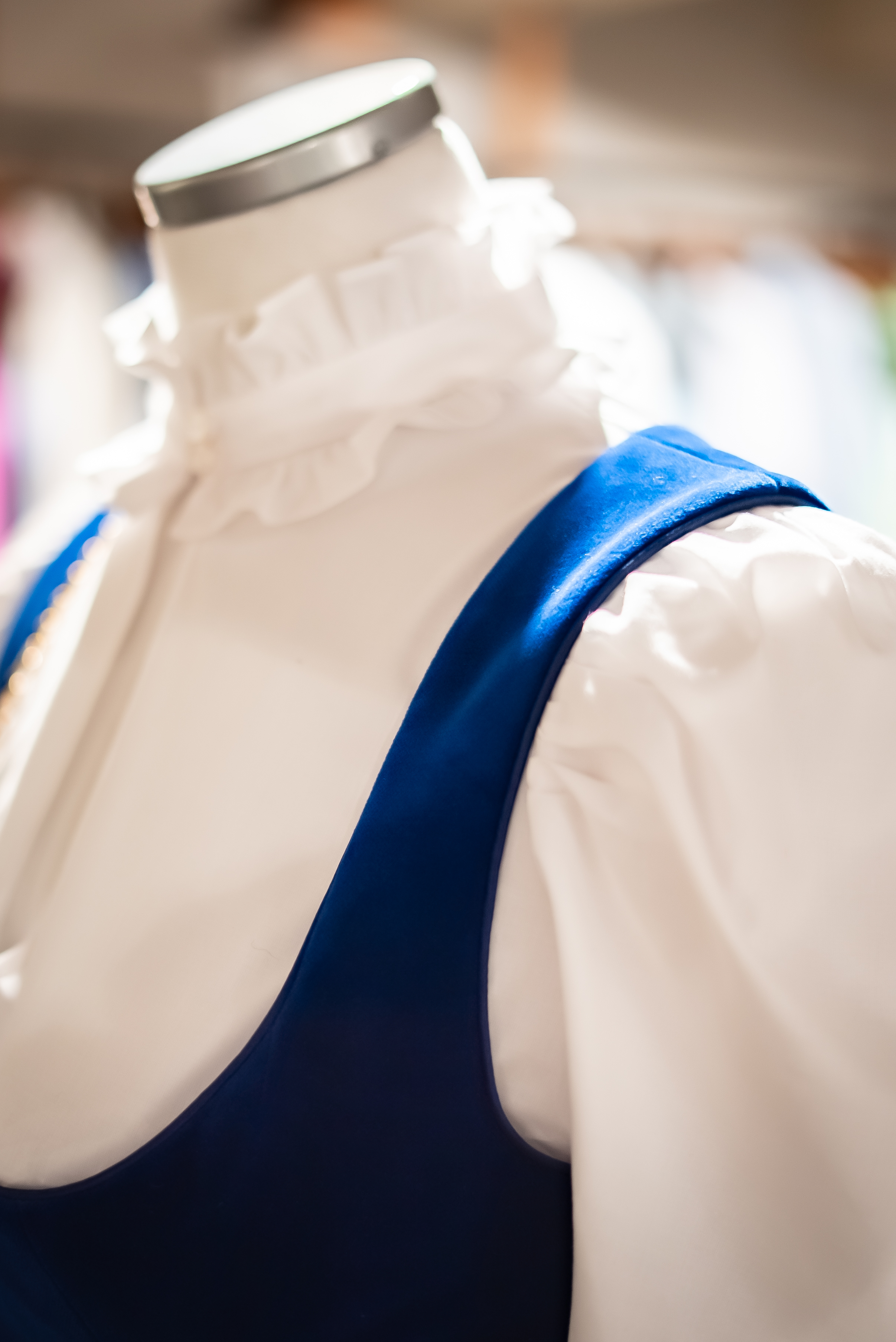 Dirndlbluse auf feiner Baumwolle mti 3/4 langen Arm. Der klassische Stehkragen ist mit eine Rüsche verziert und macht diese Bluse so besonders. Damit keine Knöpfe den Ausschnitt stören wird die Bluse zum Anziehen über den Kopf gezogen.