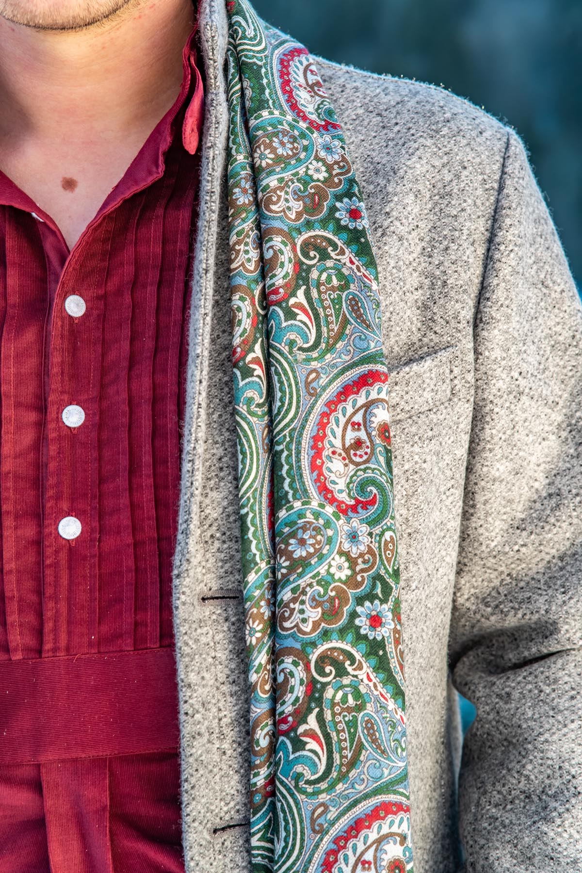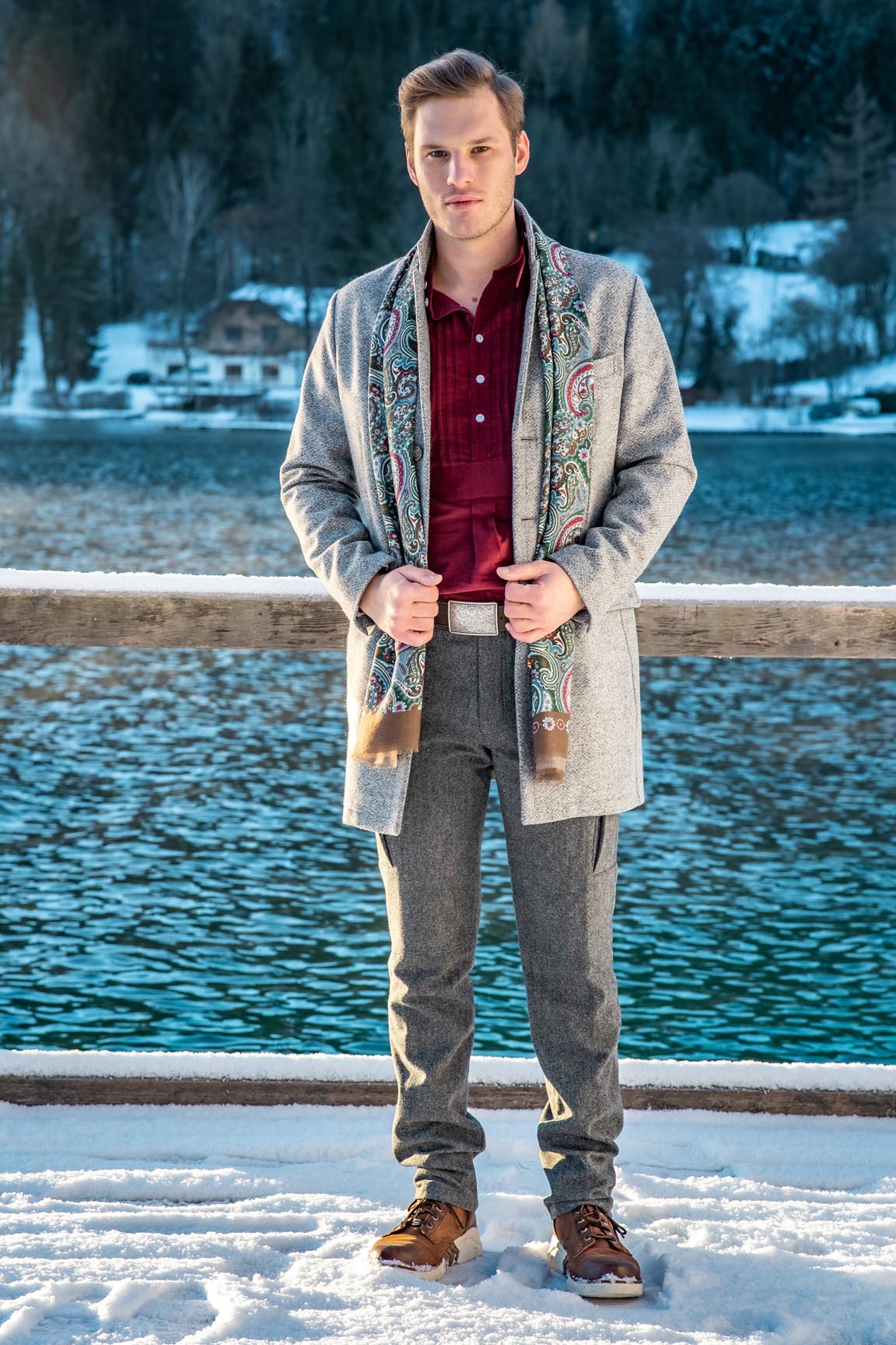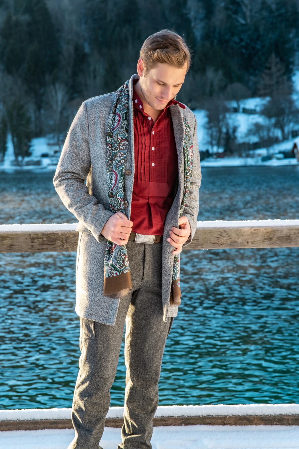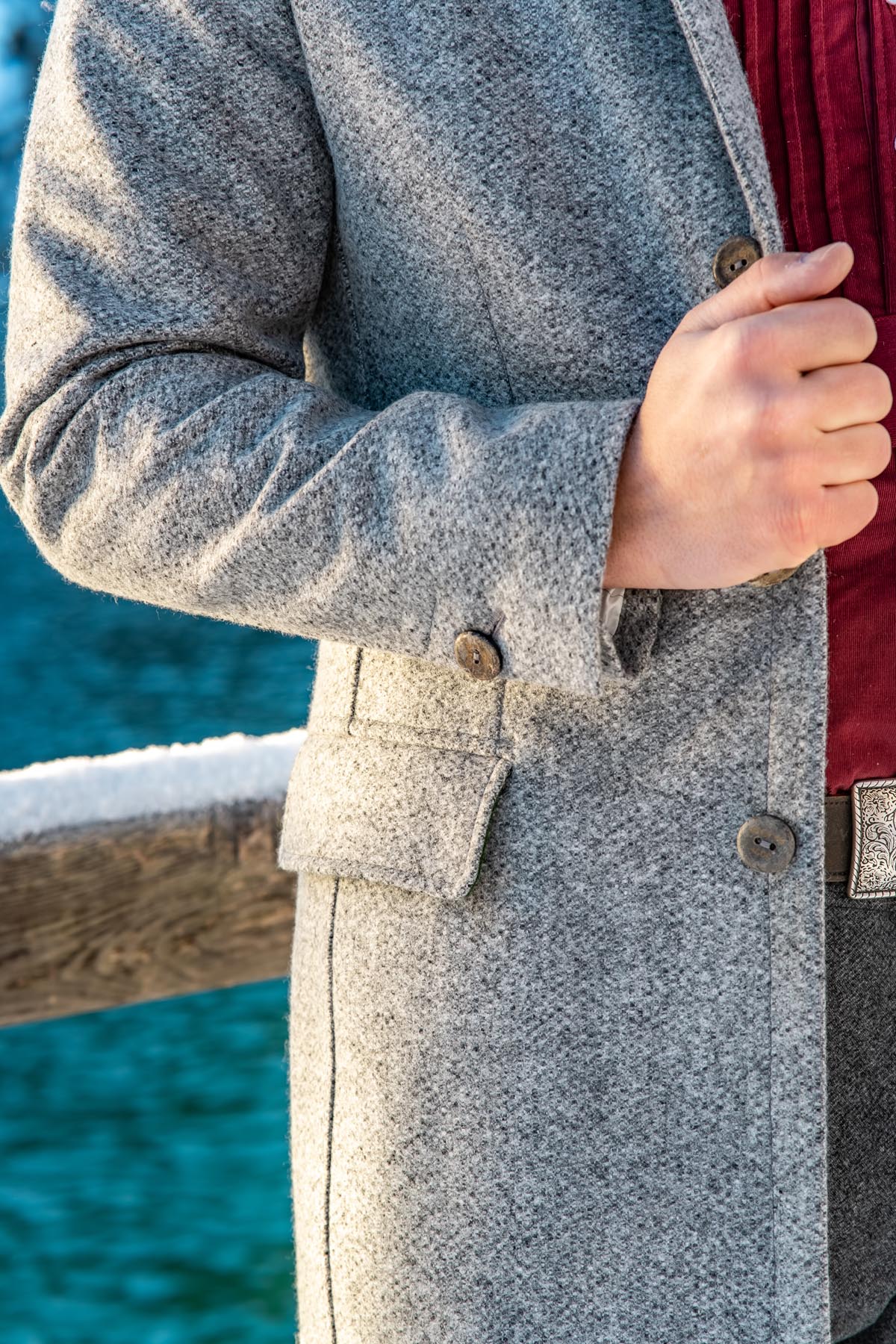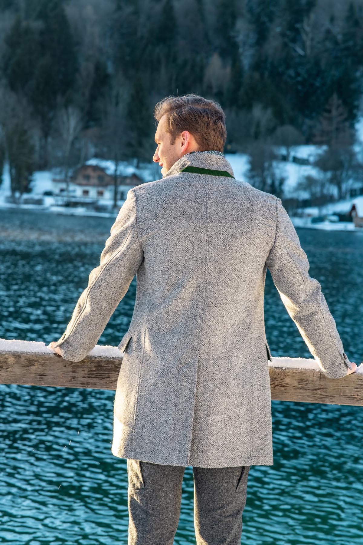 Klassischer Herren Lodenmantel von Steiner1888 aus der Steiermark, Brust_Leistentasche, Pattentasche mit grünem Futter und Revers, hochwertige Holzknöpfe