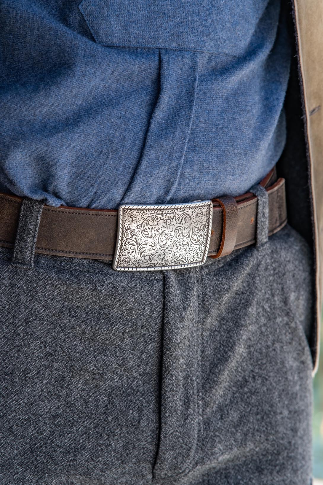 Ledergürtel in Rindsleder mit silberfarbener Schließe und gesteppten Rand, ca. 4cm breit