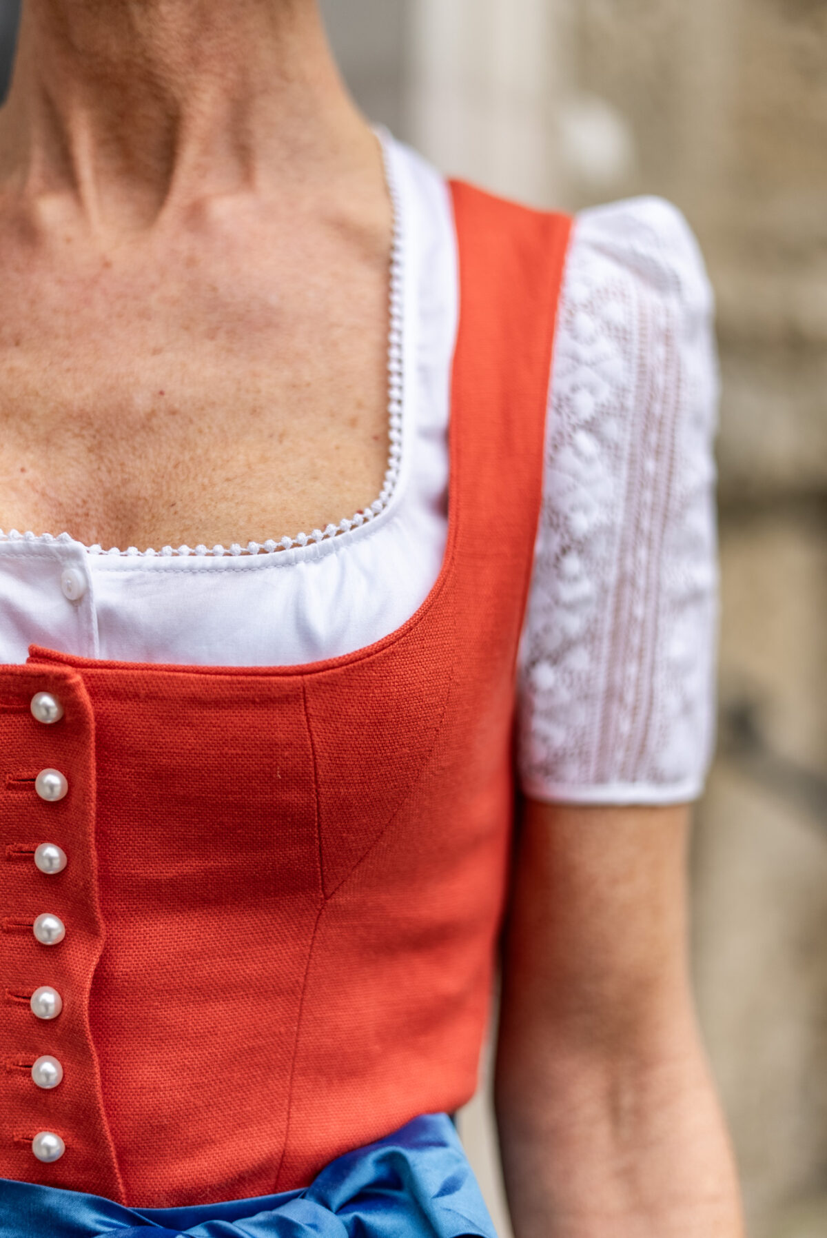 Dieses Heimatwerk Dirndl besticht durch seine Farbe und Eleganz. Hochwertiges Leinen in Koralle wurde im Miederschnitt im Oberteil verarbeitet und mit Knöpfen versehen. Der gemusterte Baumwollrock in den Farben Blau und Koralle wurde in Falten gelegt und auf eine 70er Länge verarbeitet und mit einem edlen Vorstoß versehen. Mit der Wildseidenschürze wird dieses Stück zu einem edlen Begleiter für jeden Anlass. Unser Dirndl wird wie alle anderen auch in Österreich produziert und hochwertig verarbeitet. Qualität die man sieht und spürt.