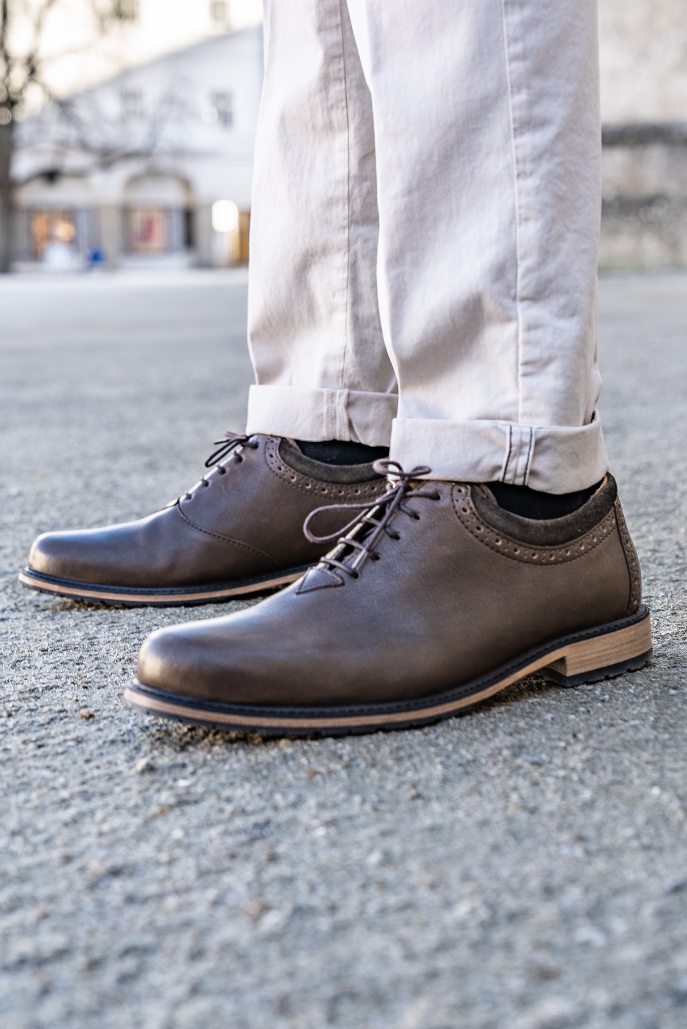 Eleganter Herrenschuh in braunem Glattleder mit Mittelschnürung. Antik-Bockleder ist ein hochwertiges Naturprodukt und jedes Stück Leder ist ein Unikat. Qualität die man spürt von Dirndl und Bua. Mit diesem Paar haben Sie einen zeitlosen Klassiker, dermit der Zeit nur noch schöner wird.