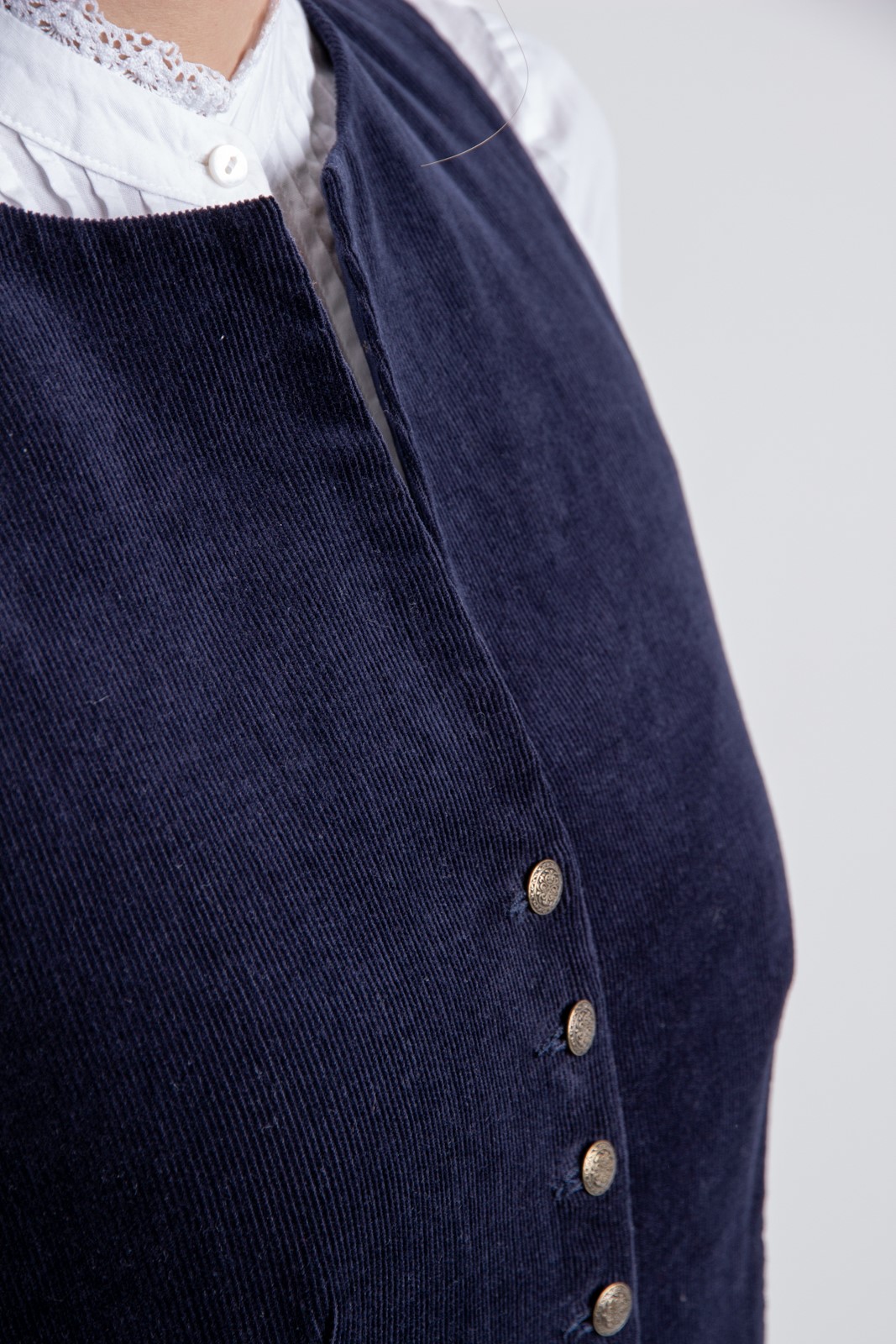Diese Katha ist aus einem dunkelblauen Baumwoll-Cord und ist im Oberteil mit einer zartbedruckten OEKO-Tex Baumwolle gefüttert.