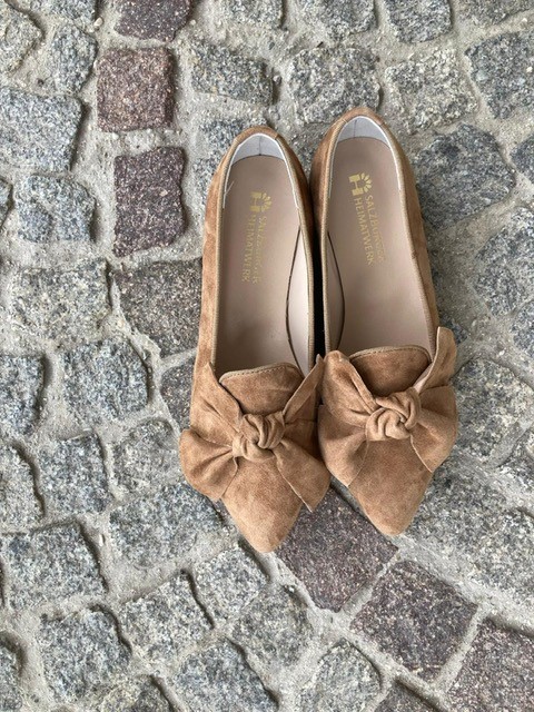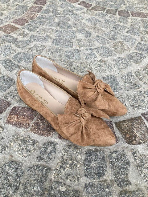 Damenschuh aus der „Salzburger Heimatwerk Kollektion“ aus weichem Rauleder in braun/beige mit Masche. Eleganter Schnitt – passt sowohl zu Hose, Kleid oder Rock.