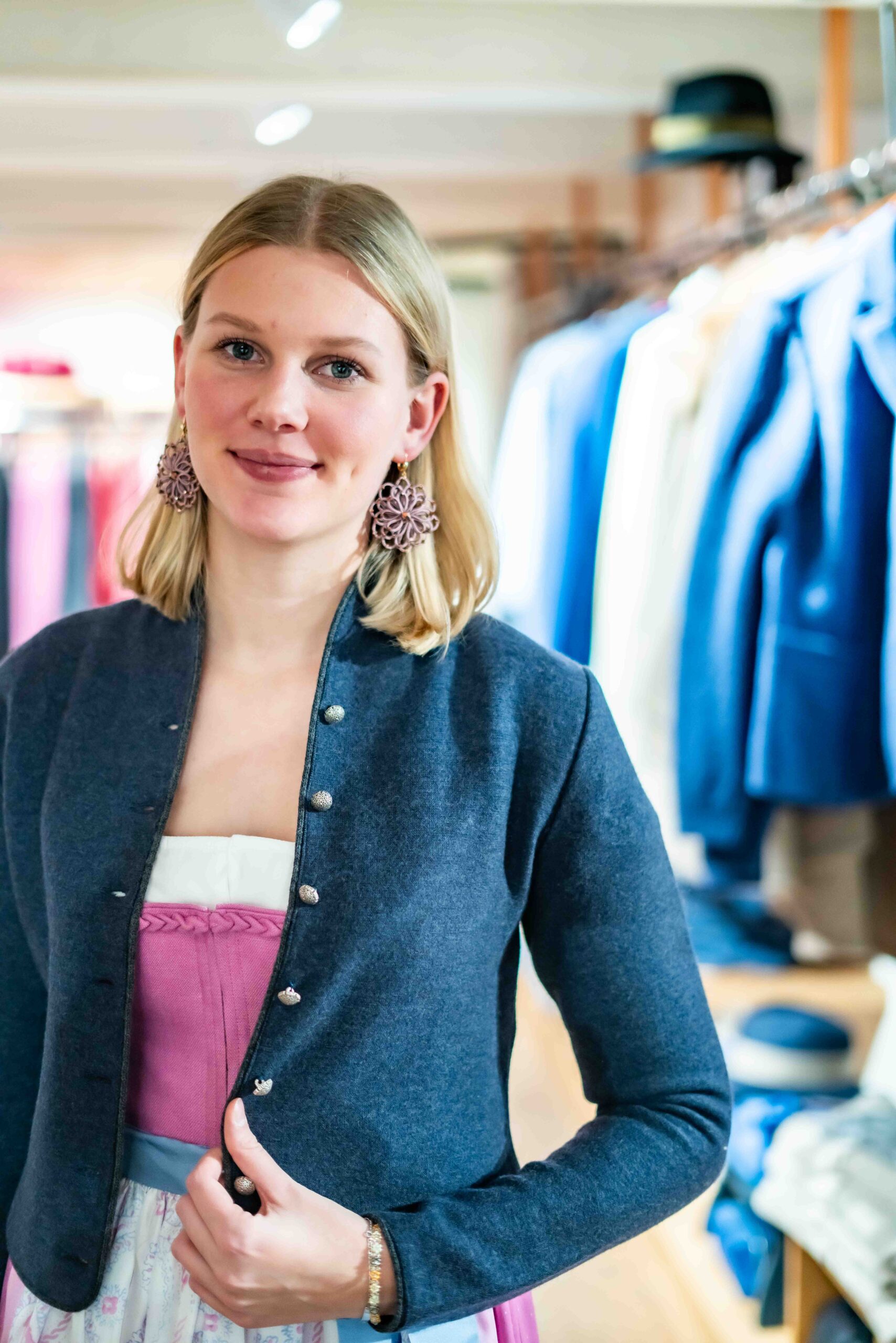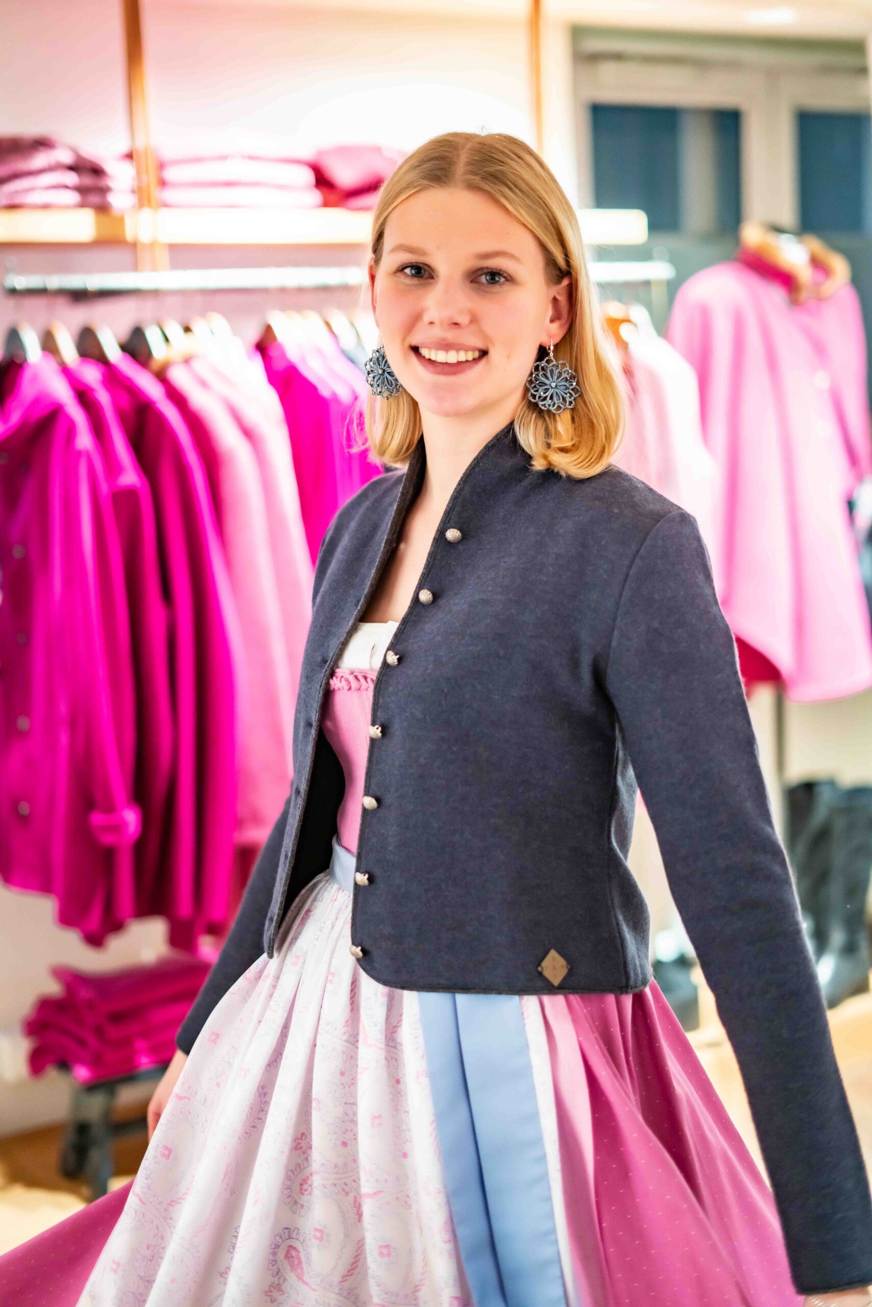 Leicht gewalkte Dirndljacke aus blau-melierter Wolle mit anthrazit farbener Einfassung und Silberknöpfen. Der Kelchkragen schmiegt sich perfekt an – so haben Sie eine universell einsetzbare Jacke für Kleider, Dirndl oder auch zu Röcken.