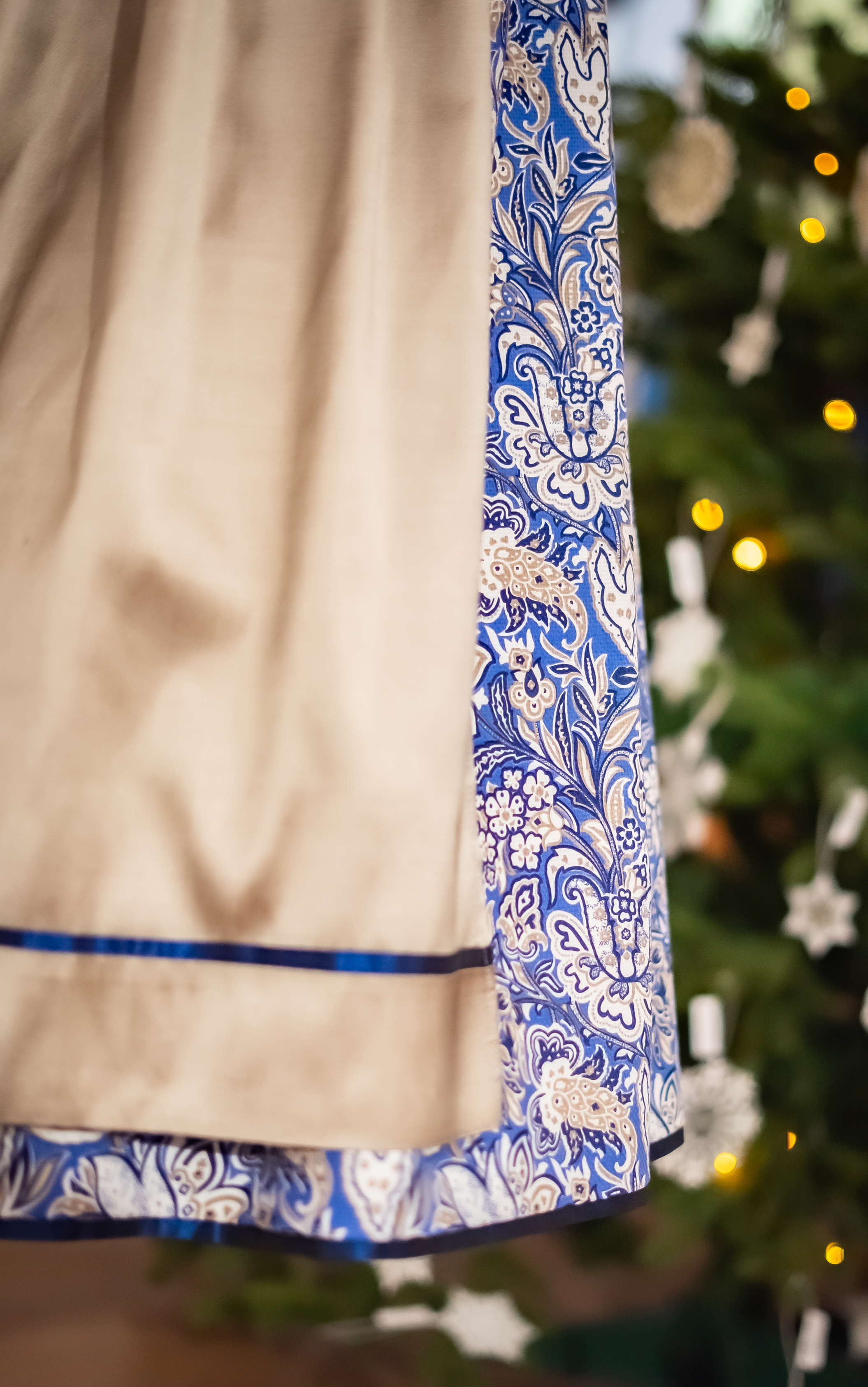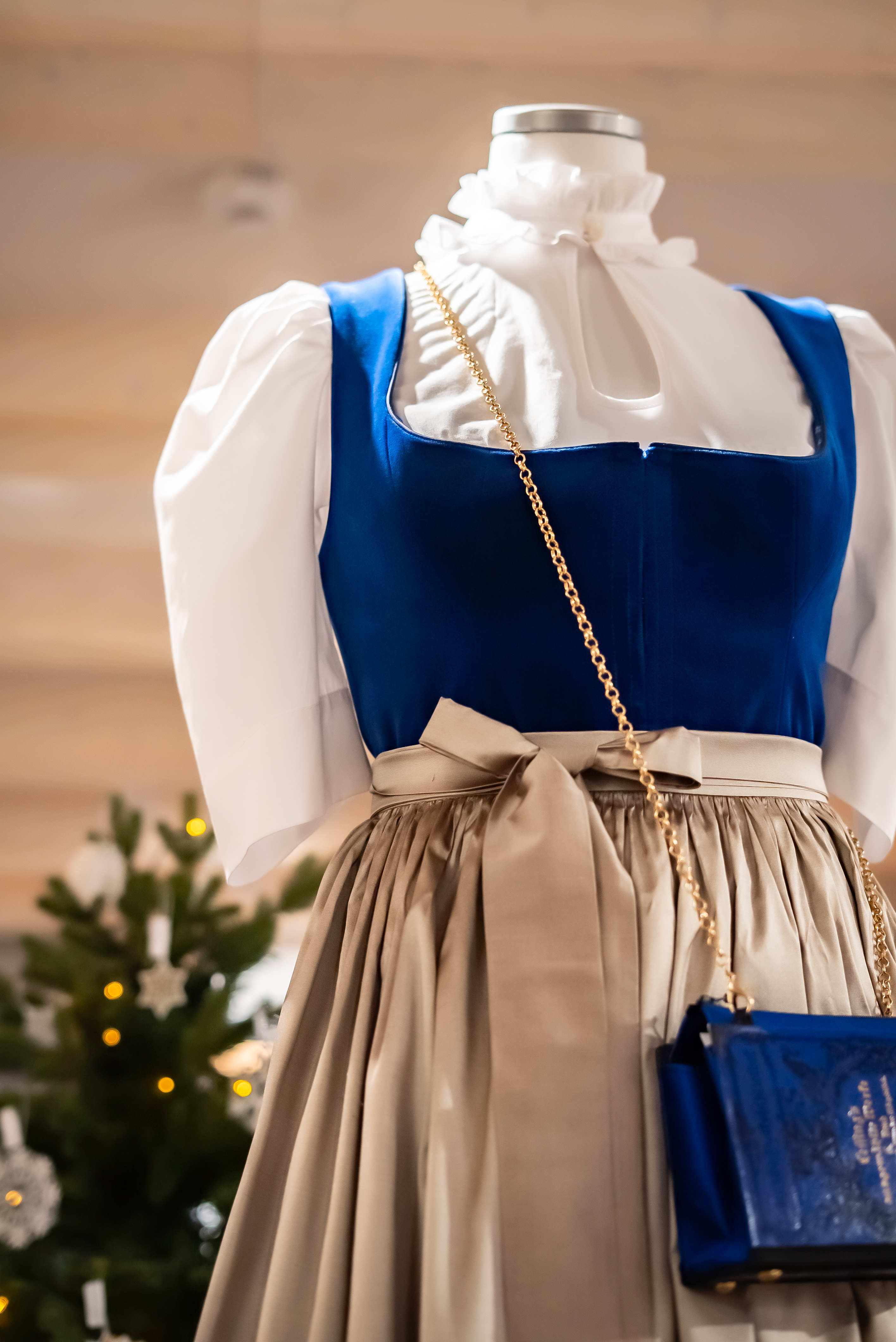 Elegantes Dirndl mit einem edlen Samtoberteil in mittelblau im Miederschnitt mit Hackenverschluß. Der herrlich gemusterte Baumwoll-Rock mit einem Vorstoss aus blauem Seidentaft ist genau so ein festliches Detal, wie die Seiden Passepoile. Die farblich abgestimmte Seiden-Taftschürze ergänzt das festliche Erscheinungsbild. Qualität aus Österreich die man sieht und spürt. Durch die 80er Rocklänge ist dieses Dirndl aus der Werkstatt des Salzburger Heimatwerks ein perfekter Begleiter für festliche Anlässe.