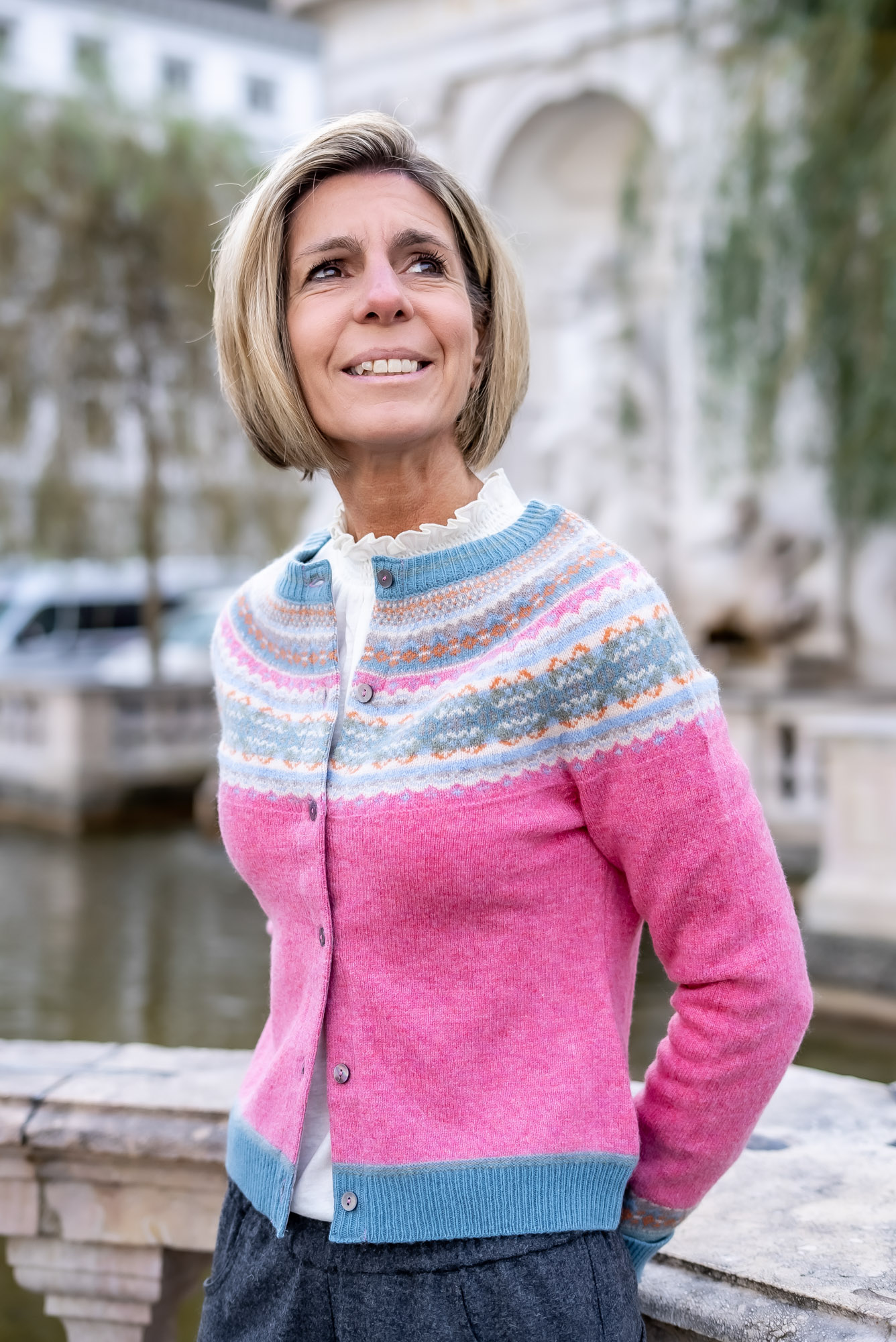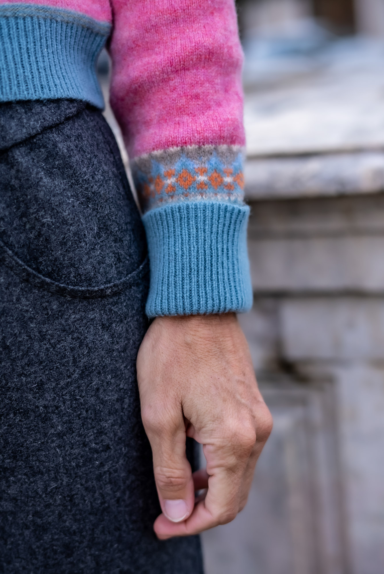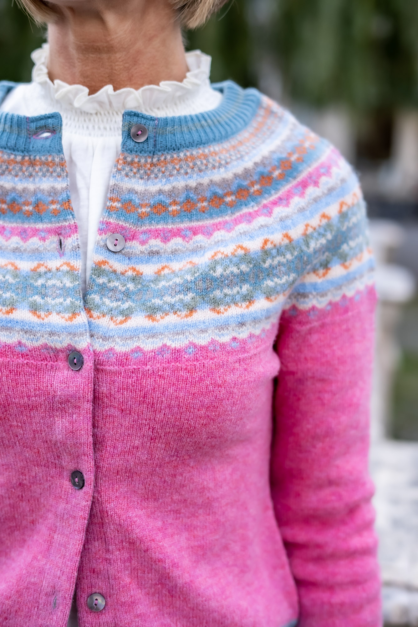 feine Wolljacke in rosa mit langen Ärmeln – am Ausschnitt und Ärmelbündchen bunt gestrickt in „Bordürenoptik“ in blau-grau (ca. 15cm breit am Ausschnitt) die Knopfleiste ist mit einem Ripsband hinterlegt. Länge ca. 48cm in der Rückenlänge gemessen incl. Bünchen