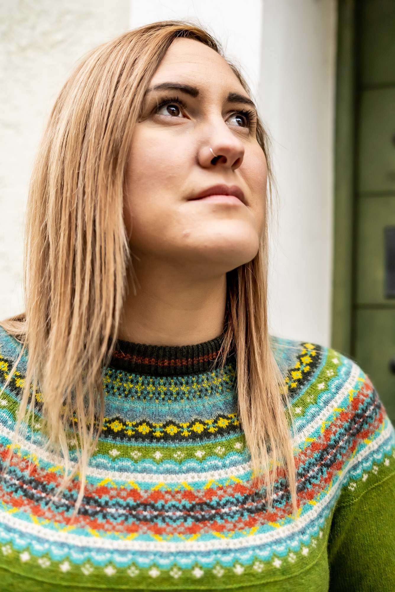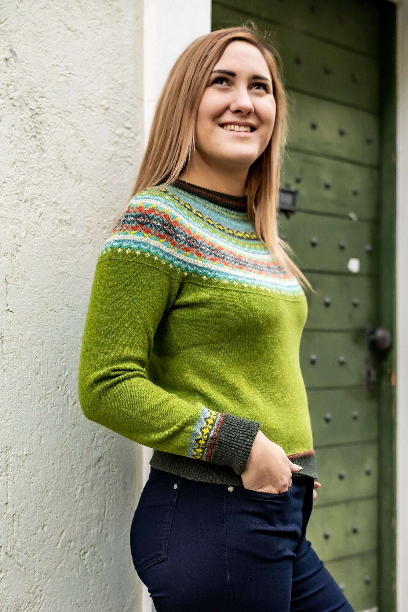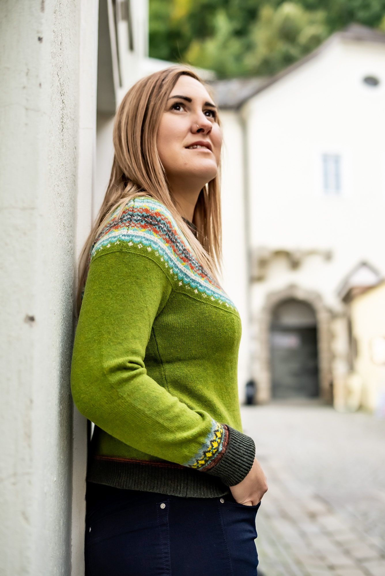 feiner Wollpullover in moosgrün mit langen Ärmeln – am Ausschnitt und Ärmelbündchen bunt gestrickt in „Bordürenoptik“ (ca. 16cm breit am Ausschnitt) Taillienlang geschnitten (ca. 48cm Rückenlänge incl. Bündchen)